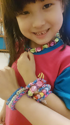 2013/07/06星期六早上參加完禾禾園遊會後,我們去市區吃東西逛光南.發現了很夯的彩橡皮圈手環編織.於是買了兩包回家試試.很簡單照著盒裝說明禾禾自己也編好了,再配上園遊會的DIY的手環.哇.顏色好繽紛喔。