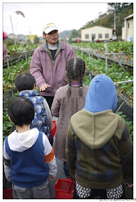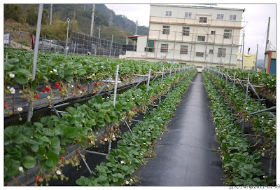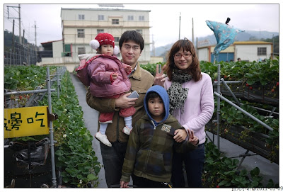 吃吃喝喝完,直接去採草莓,路邊有甜美高架草莓的招牌,好像網路上有看到,就是這家了。老闆很大方先洗一籃讓我們試吃,再和小朋友說明要小心,不要跑,不要剪花喔。大伙兒開始賣力的剪草莓。
